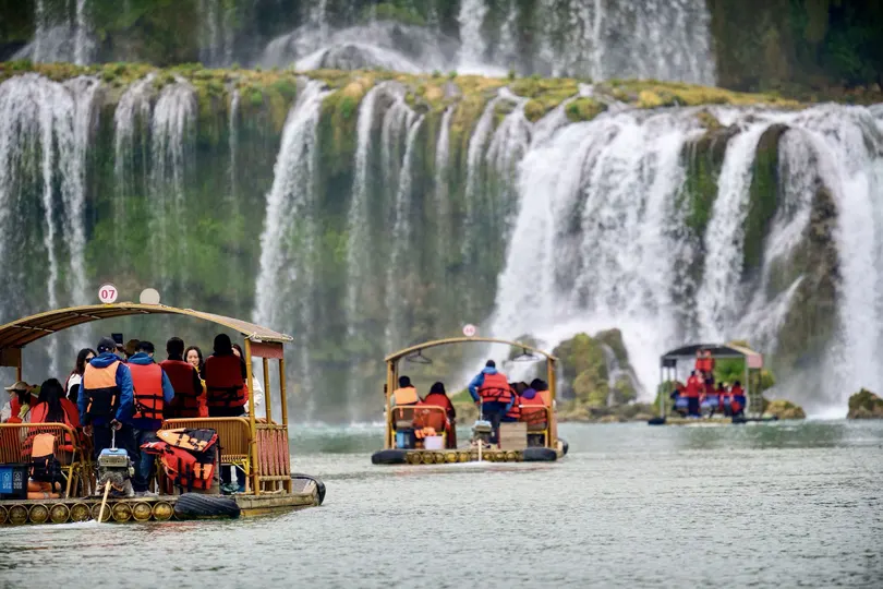 德天瀑布位于广西壮族自治区崇左市大新县硕龙镇德天村,中国与越南边境处的归春河上游,瀑布气势磅礴、蔚为壮观,与紧邻的越南板约瀑布相连,是亚洲第一、世界第四大跨国瀑布,年均水流量约为贵州黄果树瀑布的三倍。