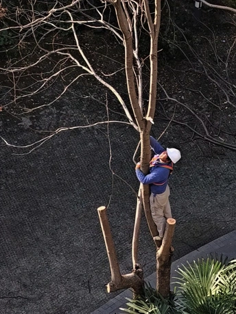 冬日暖阳下,一位工人戴着安全帽攀爬在光秃的树干上作业,专注为城市树木“梳妆”,尽显劳动者风采。