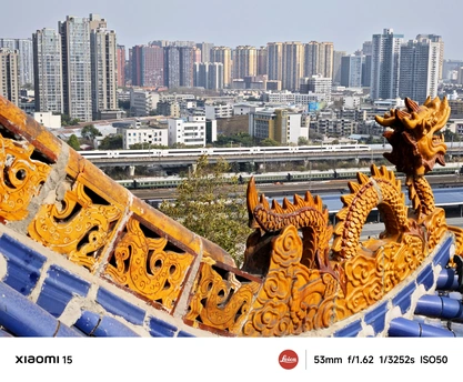 龙在中华文化中一直都是祥瑞的象征。将焦点对准在城市间穿梭的和谐号,龙吻为前景,此时现代城市元素与古建筑文化相结合,形成古今对比。