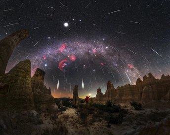 2025年双子座流星雨全景,来自云南元谋土林→元谋土林位于中国云南省楚雄市元谋县,是一种由长期流水侵蚀形成的自然地貌,与路南石林、陆良彩色沙林并称为云南三大天造奇林。元谋土林的星空也非常壮观,林内高低错落的土柱在星空下勾勒出奇特的剪影,有的像守护银河的巨人,有的像沉睡的怪兽,仿佛让人闯进了科幻电影里的场景。