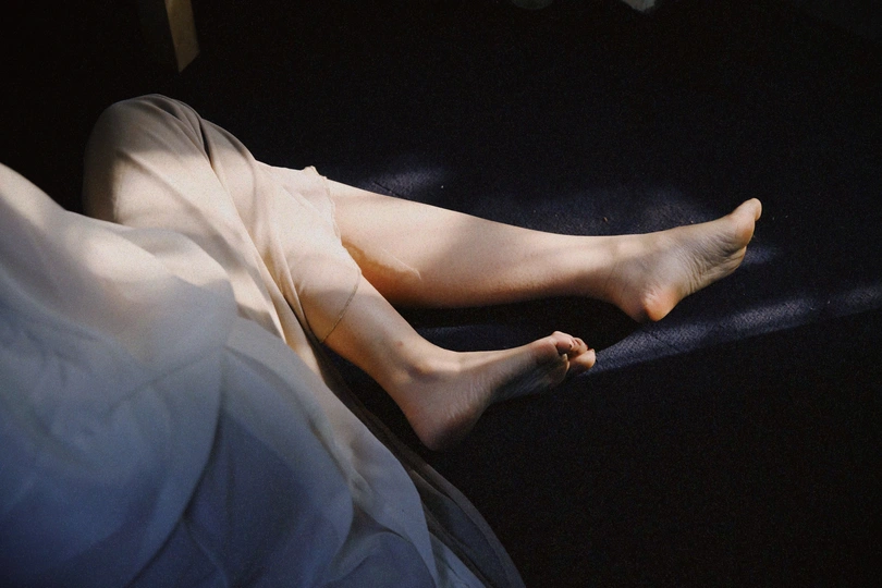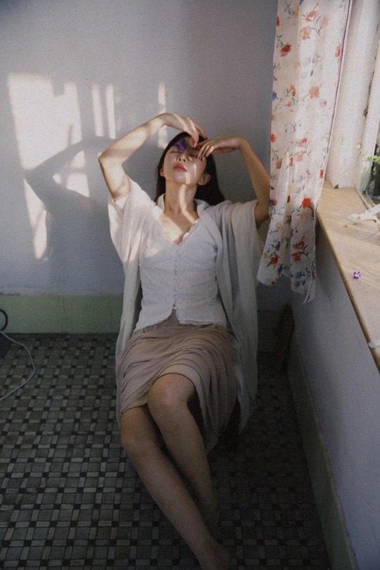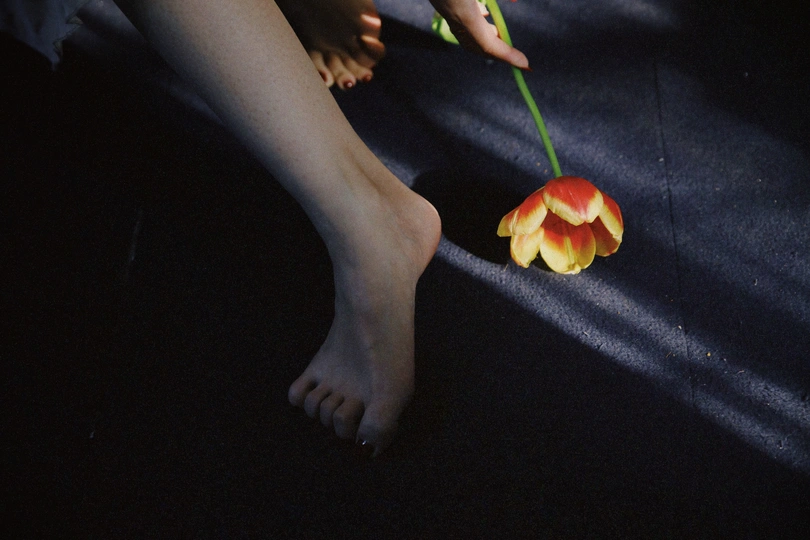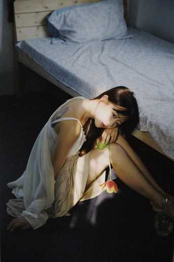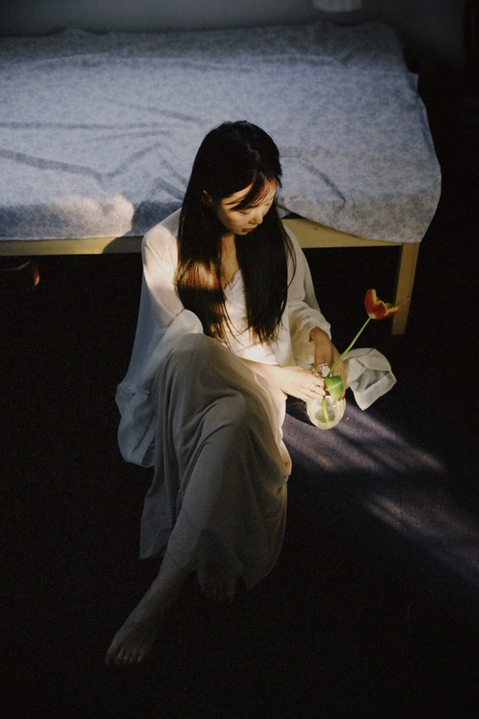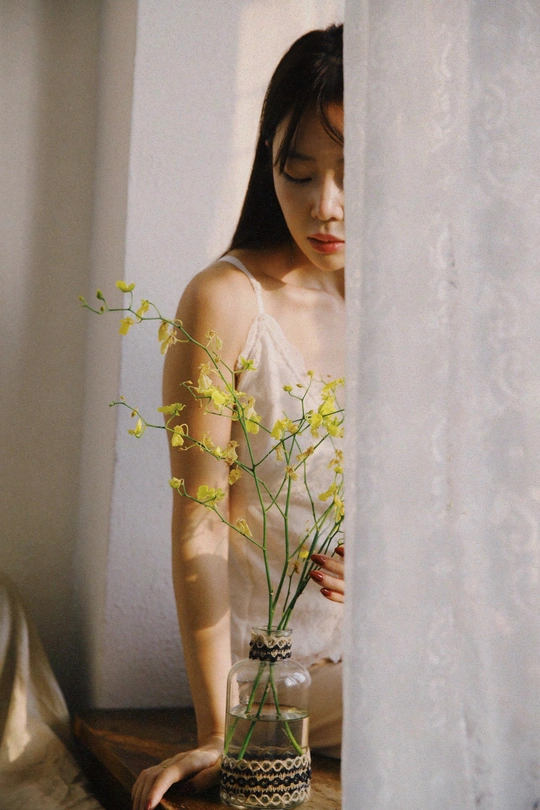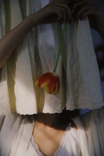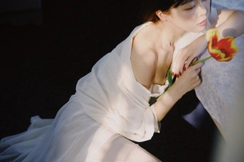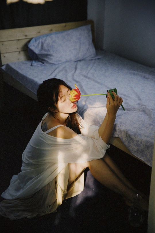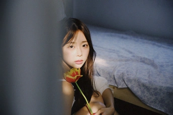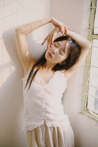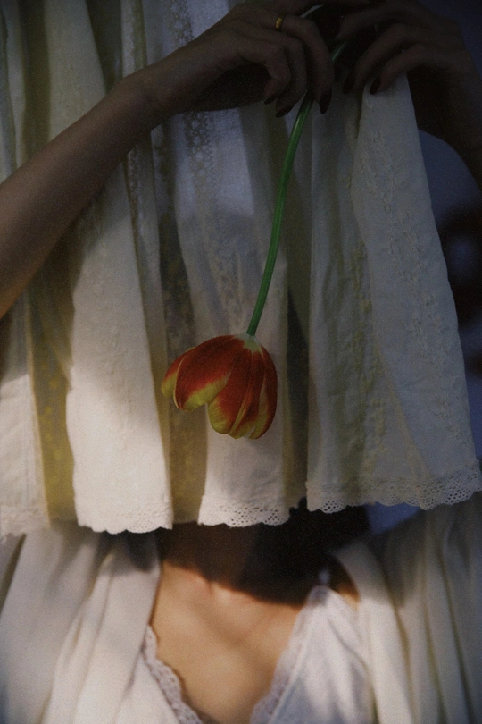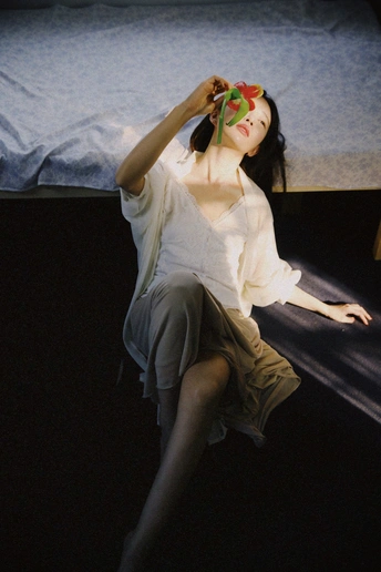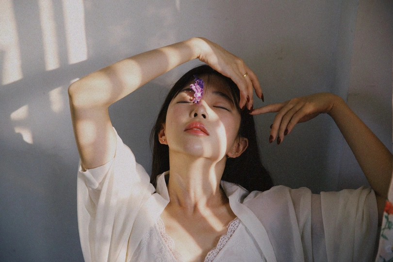 闭眼是向内的潮汐, 在光与影的缝隙里, 为自己盛开一次。 指尖的绯红, 衣褶的蕾丝, 都成了静默的诗行。 而那朵紫,是眉间未说尽的韵脚, 枕着柔软的长发, 与尘埃一同沉降。 嘘——