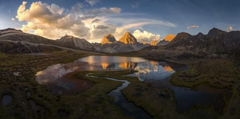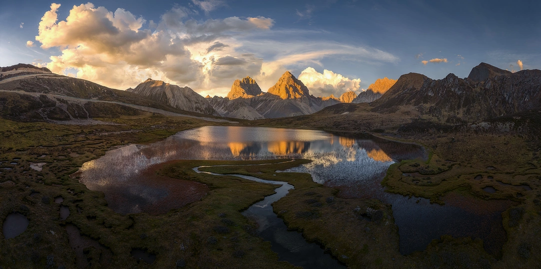 扎瓦拉垭口的日落,我在画面左前方远处的湿地操作相机拍摄日落,无法兼顾这个海子,于是采用无人机飞过来低空拍下了这个画面