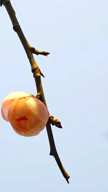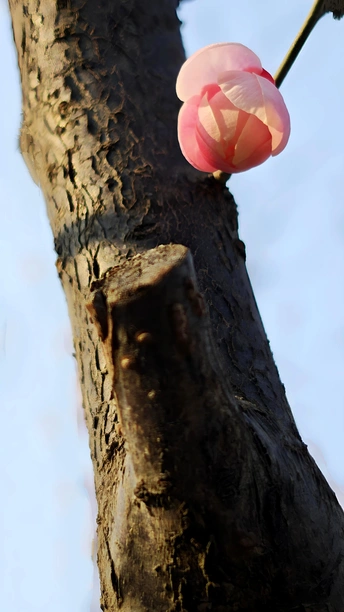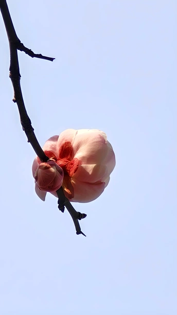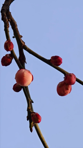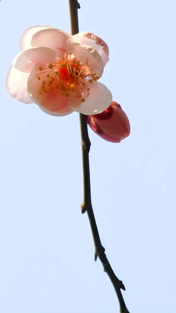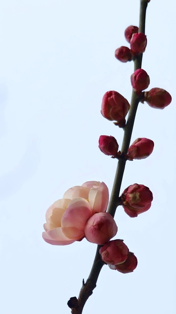 因花瓣粉白,如宫女妆容得名。在严寒中,梅开百花之先,独天下而春。宫粉梅最漂亮的三个品种:淡妆宫粉、小宫粉和粉妆台阁。