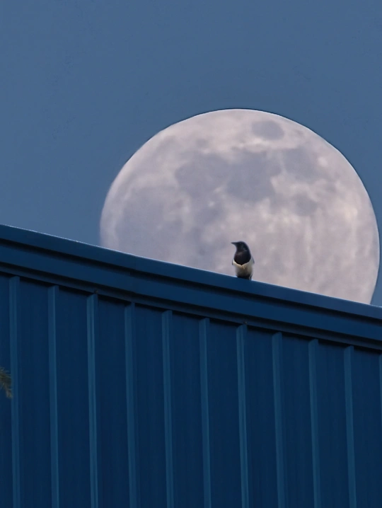 暮色沉下去的时候,我正靠在窗边发呆,一抬眼就撞见了这幕温柔。靛蓝色的波纹瓦檐像被晚风熨平的绸缎,在暗蓝的天色里泛着哑光的绒感。一只鸟安静立在檐角,小小的身子凝定成一枚剪影。它没有聒噪,也没有急着归巢,只是偏着头,和我一同望向悬在身后的满月。月亮很圆,像被水洗过的玉盘,清辉漫过瓦楞,漫过鸟雀的羽毛,也漫过远处楼宇的轮廓。城市的喧嚣在这一刻退得很远,只有风掠过檐角的轻响,和月光流淌的寂静。我忽然觉得,这只鸟或许和我一样,是此刻人间的异乡客。我们都在奔赴的途中,偶然在这方檐角与满月下,获得了片刻的停泊。它站在檐上看月亮,我站在窗前看它,我们共享着同一片月色,也共享着这份不期而遇的松弛。晚风渐凉,月光却暖。原来最好的治愈,从不是刻意的奔赴,而是一抬头就能撞见的圆满。