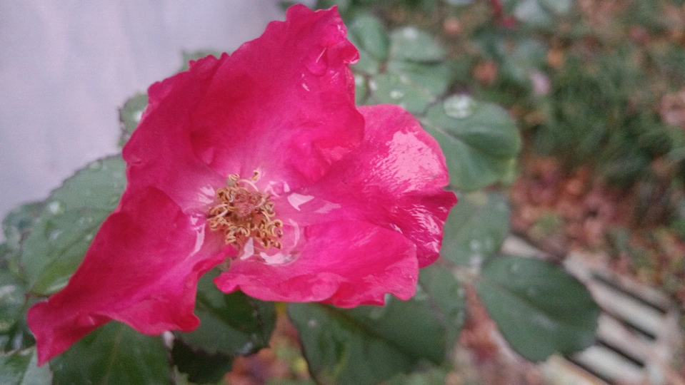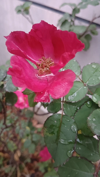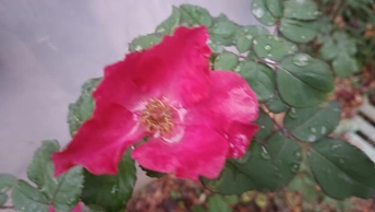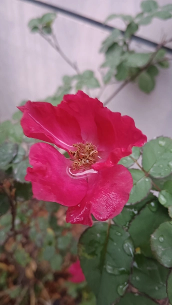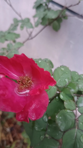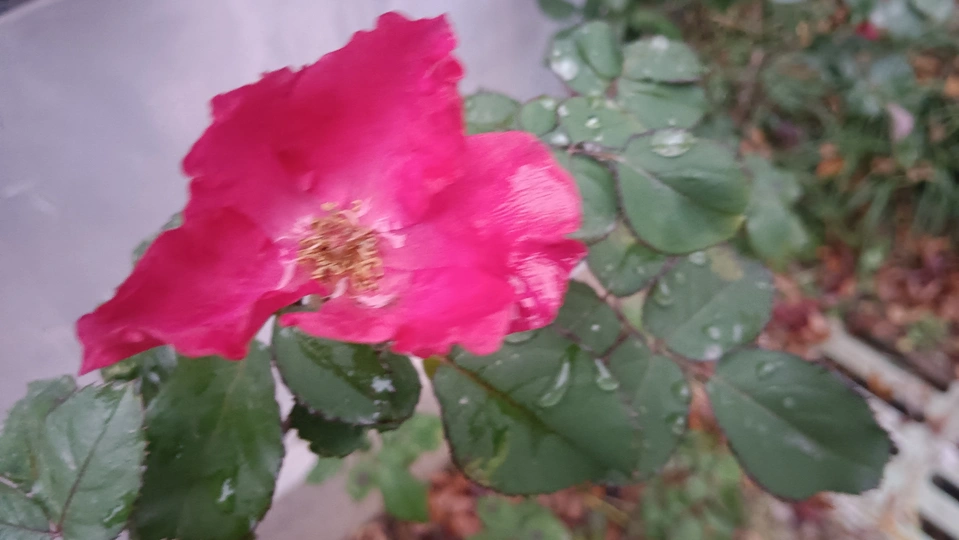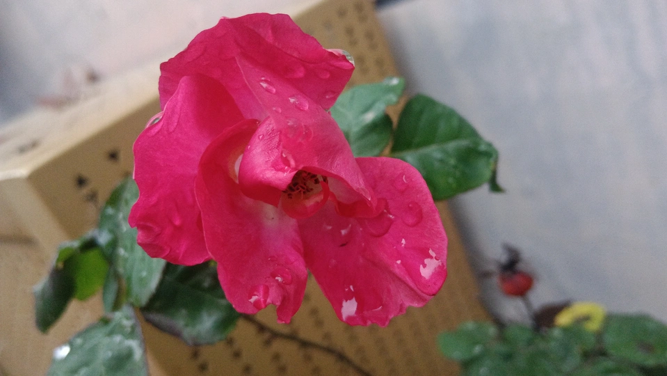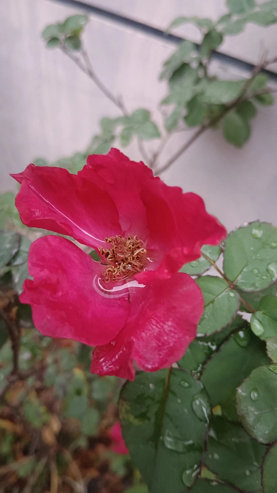 绯玫的湿绒暖笺 纸箱与灰墙铺就粗粝的素笺,这朵绯玫是沾了湿绒的暖焰——艳红瓣裹着凝露的亮,像把揉碎的霞色嵌进了冷境,连瓣边的微蜷都成暖笺里颤过的软痕。 风擦过时,花身颤成轻晃的红浪,把墙沿的凉色烫出片柔。它不管尘箱作伴,偏要在笺旁铺展艳色,像偷藏温软的客,在糙意里窝出点鲜活的暖。 凑近看,瓣上的露滴是暖笺凝的光,蕊尖的暗纹是光里嵌的软,连叶间漏下的碎影,都成了这绯色漾开的余韵。原来美从不是华境的喧闹,是粗隅里倔强的短章——哪怕沾了湿痕、身倚冷墙,仍要把刹那的亮,写成寂境里最软的一握。 风又轻,露滴蹭过瓣尖坠向泥尘,是这暖笺的温柔落款;连藏在叶后的小苞,都成了这艳色里轻和的伏笔。它像没介怀周遭的潦草,只顾把自己活成粗隅里,最烫人的那笔暖红。