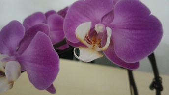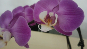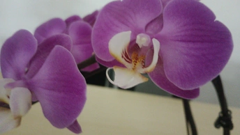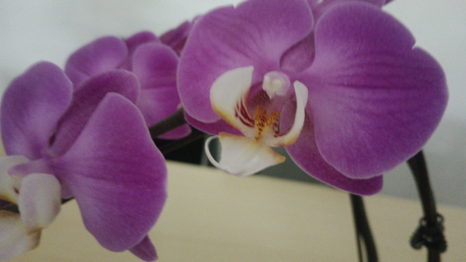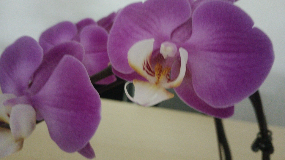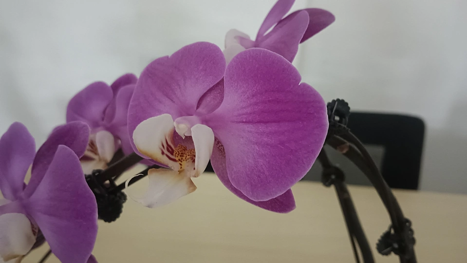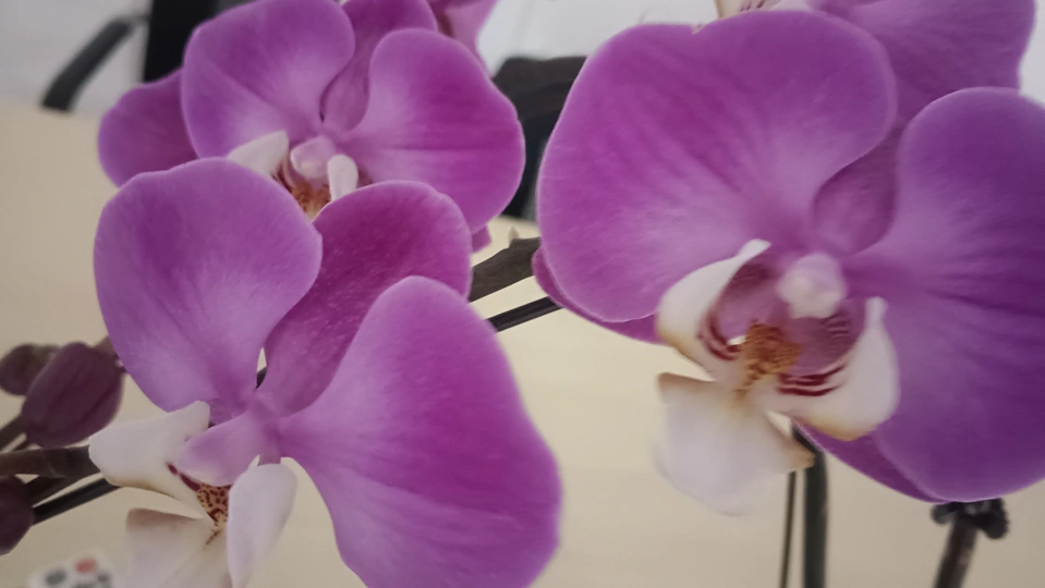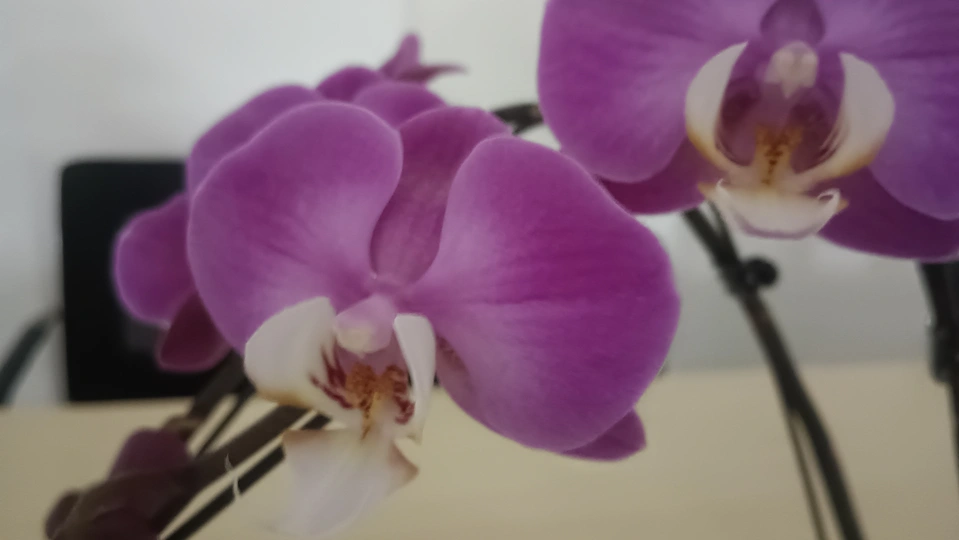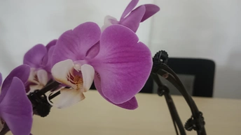 紫兰的案头柔笺 素墙与木案铺就简净的素笺,这簇蝶兰是落在这里的紫雾——艳紫瓣裹着白蕊的暖,像把揉碎的星色嵌进了日常,连瓣边的细褶都成柔笺里颤过的软痕。 风擦过时,花身颤成轻晃的蝶影,把案头的冷调烫出片柔。它们不管支架作伴,偏要在笺旁铺展艳色,像偷藏绮梦的客,在平境里窝出点鲜活的暖。 凑近看,瓣上的细光柔笺凝的亮,蕊尖的金纹是光里嵌的软,连叶间漏下的碎影,都成了这紫簇漾开的余韵。原来美从不是繁境的喧闹,是案头里倔强的短章——哪怕身倚支架、境简意平,仍要把刹那的柔,写成日常里最软的一握。 风又轻,瓣尖蹭过邻花的残影,是这柔笺的温柔和声。