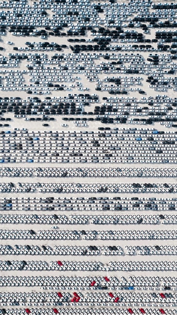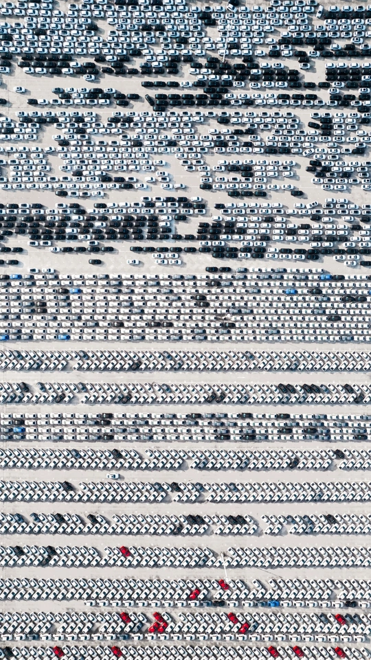 密密麻麻的出厂汽车展现了现代工业的制造能力,有序与随机交织,展现了一幅属于汽车密码的抽象画。