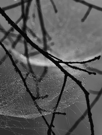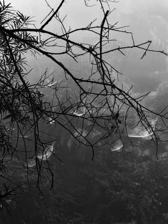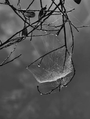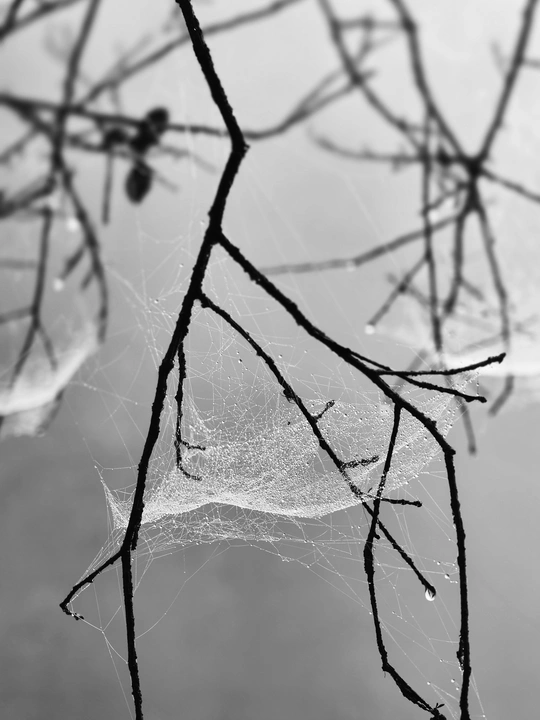 雾把天揉成一片软灰,风穿过枝桠时,蛛网便在明暗里荡开细碎的涟漪。 它是冬风里不肯松劲的丝,把路过的雾粒、尘絮都温柔接住,在空茫里织出一张细密的网。没有惊天动地的张力,却用最纤弱的线,把散碎的光阴轻轻拢住,像在替这萧索的冬,存着一点不肯妥协的温柔。