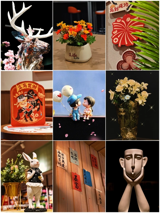 午后的阳光漫进小店,随手拍下这些可爱的瞬间。彩绘鹿头的肌理里藏着颜料堆叠的温度,仿真花簇在一旁温柔盛放;“Life”花盆里的橙黄花朵,把明快的色彩揉进日常。墙上的“马到成功”挂饰与“立马发财”的红牌,藏着人们对新一年最直白的期许。窗边的玩偶小人捧着气球,仿佛下一秒就要飞向蓝天;透明花瓶里的干花,将夏日的浪漫定格成永恒。穿西装的兔子摆件绅士又俏皮,木墙上的手写标语,每一句都在诉说着对生活的热爱。这些随手定格的细碎画面,没有宏大的叙事,却满是松弛的烟火气。它们不是什么特别的风景,却是组成我生活的温柔边角料。