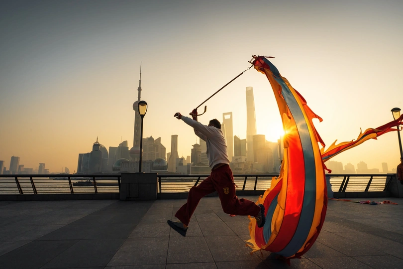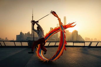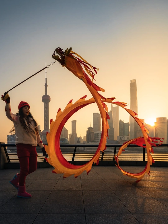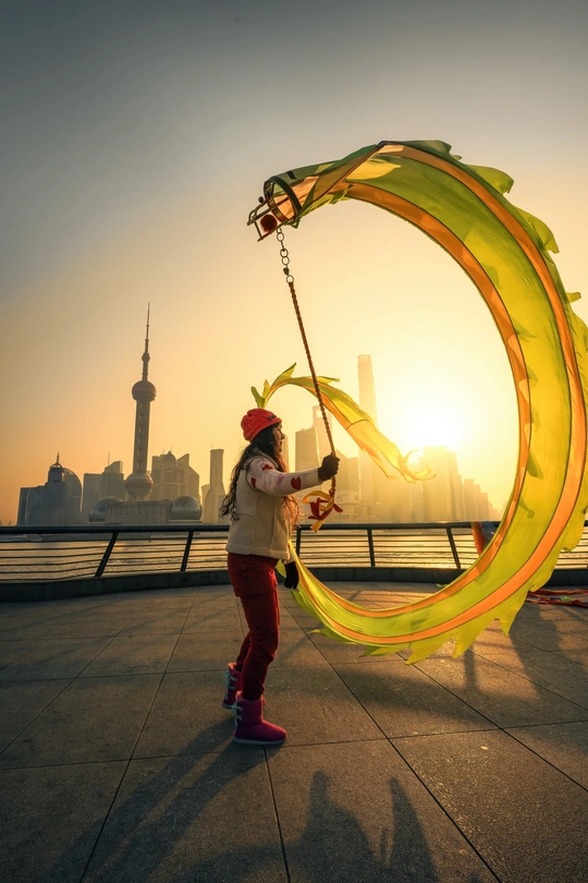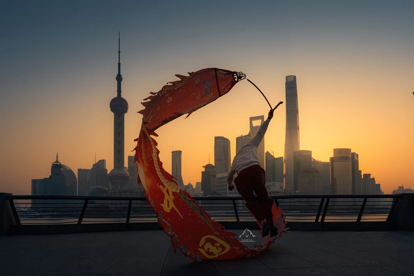 突然冒出的念头,去看看凌晨四点的外滩! 原来清晨的外滩也并不是空无一人,晨练的大爷大妈,早早的就来到了这里,而他们的晨练项目很是新颖~舞龙! 和传统的舞龙不同,他们的龙是由一个六斤重的龙头牵上一条像龙身一样的飘带,手牵龙头划8字让龙飘舞起来,人与手上的头还会有互动,人的跃动配合着飘舞的龙,仿佛人龙合一,极具观赏性。