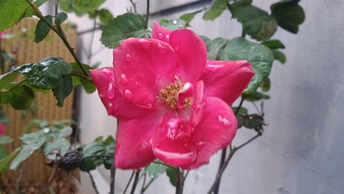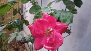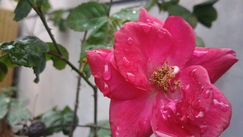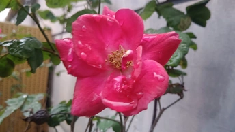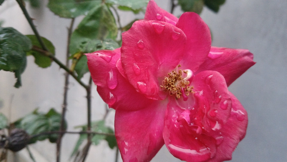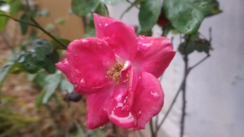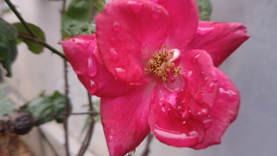 绯玫的湿绒暖笺 灰墙与枯藤铺就冷寂的素笺,这朵绯玫是落在这里的湿绒焰——艳红瓣裹着凝露的亮,像把揉碎的霞色嵌进了荒枝,连瓣边的微蜷都成暖笺里颤过的软痕。 风擦过时,花身颤成轻晃的红浪,把墙沿的凉色烫出片柔。它不管残枝作伴,偏要在笺旁铺展艳色,像偷藏温软的客,在糙意里窝出点鲜活的暖。 凑近看,瓣上的露滴是暖笺凝的光,蕊尖的金纹是光里嵌的软,连叶间漏下的碎影,都成了这绯色漾开的余韵。原来美从不是华境的喧闹,是荒隅里倔强的短章——哪怕身倚枯藤、瓣沾湿痕,仍要把刹那的亮,写成寂境里最软的一握。 风又轻,露滴蹭过瓣尖坠向泥尘,是这暖笺的温柔落款。