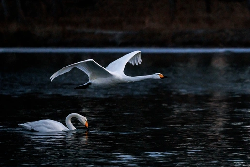当暮色给湖面蒙上深蓝滤镜,天鹅们就成了流动的光。