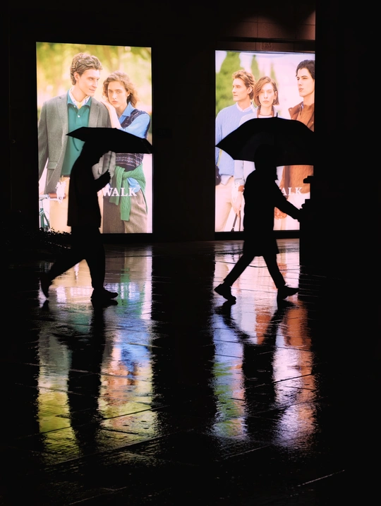 雨夜街头,行人撑伞走过,身后广告屏光影斑斓,倒映在湿漉漉的地面,如梦似幻,城市浪漫悄然绽放。