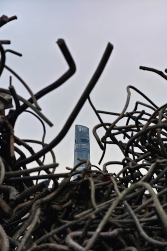 盘桓的旧钢筋,是城市建设遗落的“筋骨”,曾撑起无数楼房的诞生;远处刺破天际的上海中心高耸入云,锈迹与玻璃幕墙对望,旧时光的温度与新时代的锋芒交织,好似诉说着魔都从砖瓦铿锵到天际逐梦的成长史。
