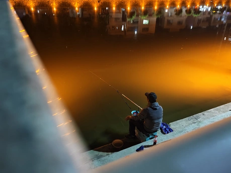 小镇的灯火坠入河面,晕开一片暖黄。钓者静坐岸边,鱼竿垂向夜色,等鱼咬钩,也等晚风把一天的疲惫轻轻吹走。