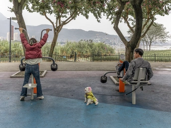 山风裹着草木香,健身器的吱呀揉进午后的松弛——她舒展肩臂,他轻晃腿脚,连裹着亮黄小衣、粉毛蓬松的毛孩子,都支棱着耳朵蹲成“观众席C位”。