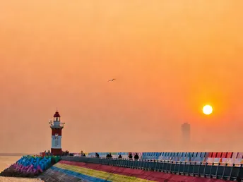 橘色的落日把海面烘成暖绒,灯塔在风里站成沉默的坐标。归鸟振翅划破软乎乎的暮色,好像所有奔波的疲惫,都能被这一场日落轻轻接住。
