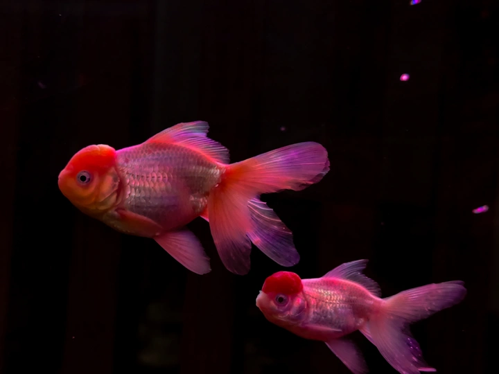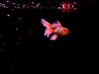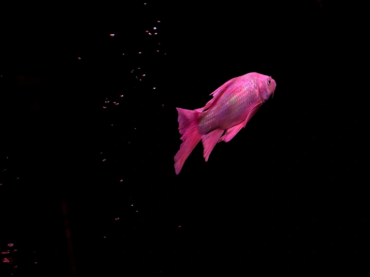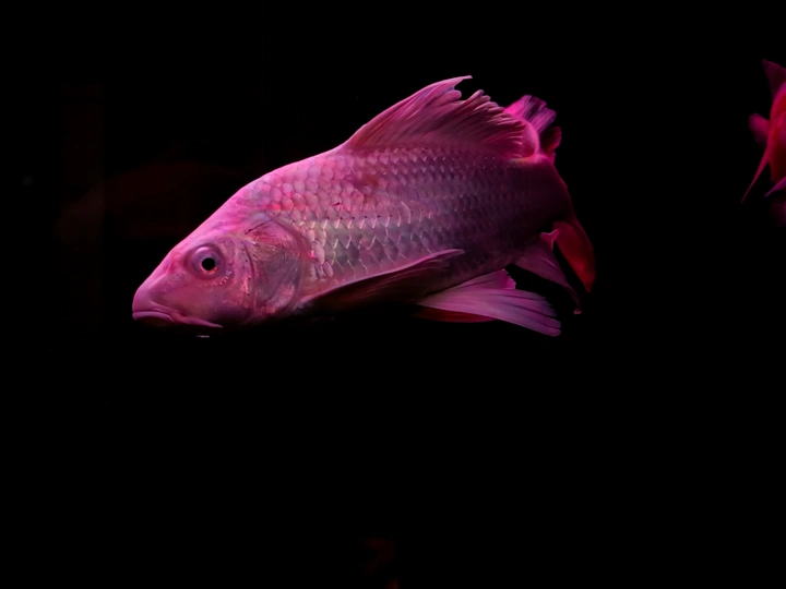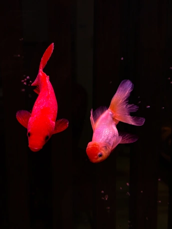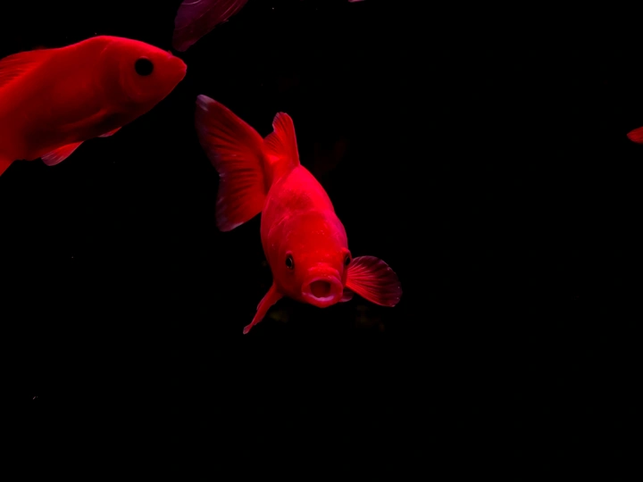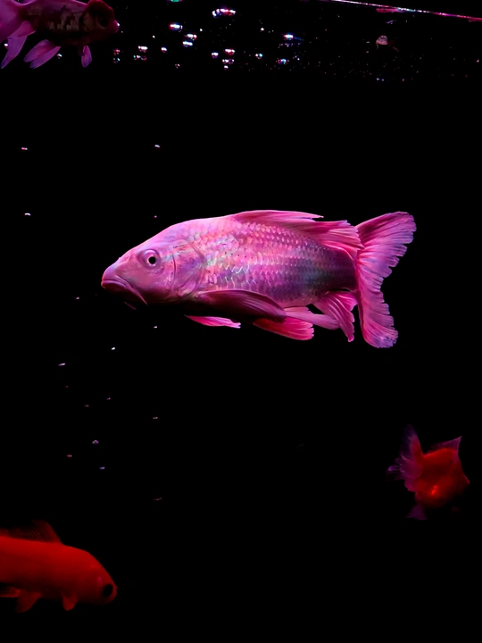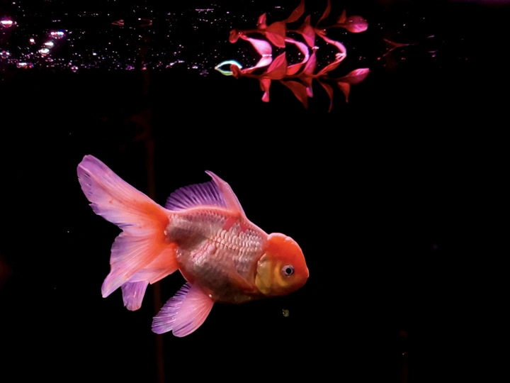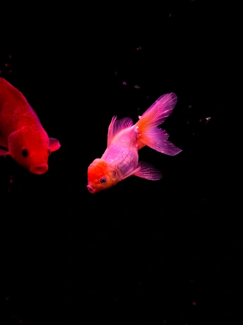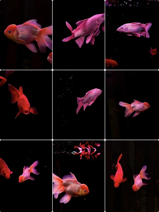 在纯黑的背景里,这些金鱼像是流动的光斑,红得热烈,粉得温柔,每一片鳞都在暗里闪着细碎的光。它们游得不急不缓,偶尔两两擦肩,偶尔独自穿梭,像一群在夜空中散步的星子。没有水草和石头的点缀,它们的色彩反而被衬得更纯粹——浓艳的红像一团跳动的火,柔粉的渐变又像揉碎的云霞,连鱼鳍舒展的弧度都带着松弛的美感。我蹲在鱼缸前看了很久,原来最简单的黑与红,也能撞出这么治愈的画面。金鱼不知道自己有多好看,只是自在地游着,把影子留在水里,把鲜活的色彩印在我眼里。有时候治愈我们的,从来不是多复杂的风景,就是这样一群小鱼,在暗里自顾自地生光,就让人觉得,安静的日子也能这么鲜亮。