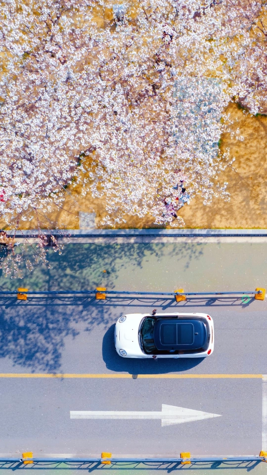 武汉西北湖畔的樱花大道,在明媚的春天,汽车行驶过绽放的樱花树下,展现了武汉城市一角的独特季节魅力。