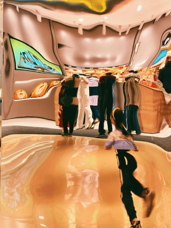 流动的曲面,暖融融的鎏金光影,将寻常的空间晕染成童话秘境。小女孩肆意奔跑,发丝扬起,带着不加掩饰的欢喜,与身后驻足的人群形成温柔的对比。光影扭曲,浪漫蔓延,童真撞进暖光里,每一寸画面,都写满人间细碎又滚烫的美好。