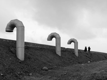 三个巨大的弧形管道,从土坡中伸出,像大地凝固的沉默。 天是阴的。两个人影站在远处,很小。 我将一切色彩抽离,只留下这黑、白,和其间无尽的灰——工业的弧与人的点,在此刻,达成了长久的对视。 它关于尺度,关于距离,关于那些无需声音的,存在本身。