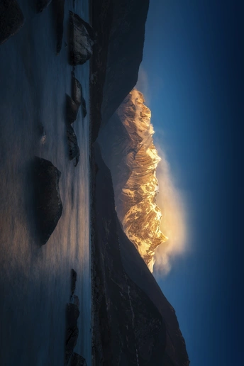 等到黄昏,南迦巴瓦终于从云雾里探出全貌。 夕阳为雪山镀上暖金,云絮缠绕在峰顶,像神明织就的金色纱幔。 雅鲁藏布江的蓝波里,揉碎了整片流动的金光。 传说看见日照金山,能幸运一整年。 此刻,风是温柔的,山是金色的,我是幸运的。