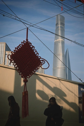 红色中国结悬于空中,与摩天楼、电线交织,行人在墙影下穿梭,传统符号与现代建筑碰撞,勾勒出魔都城市里的文化与时代交融之景。