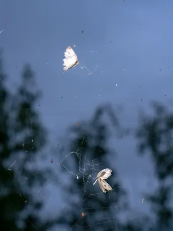 两只蝴蝶粘在了蜘蛛网上,看似平静,也是生命的起止。