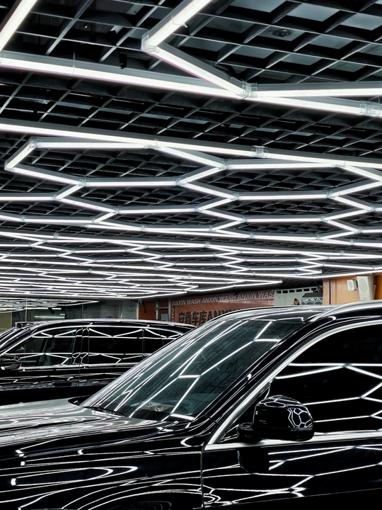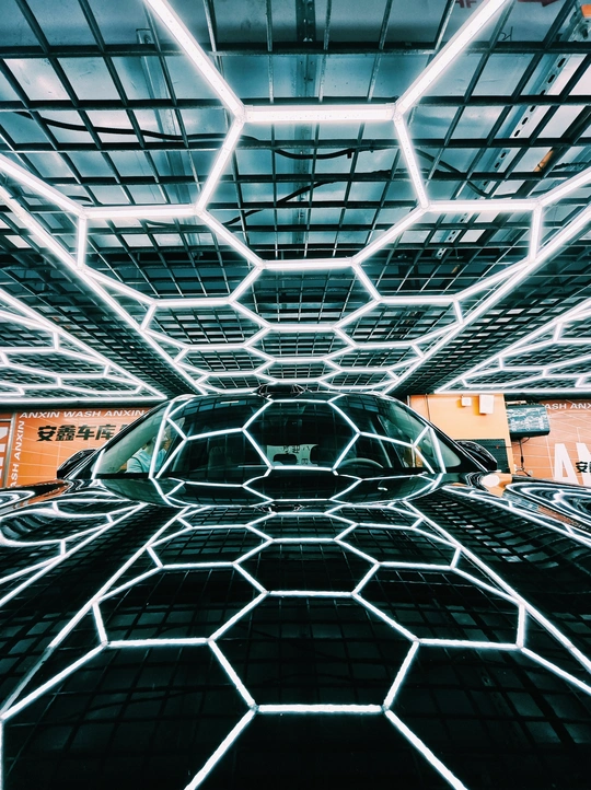 在车库的赛博世界里,六边形的光网从天而降,在车身上流淌成流动的星河。冰冷的机械瞬间拥有了赛博朋克的灵魂,每一道光纹都像是未来世界的密码。在这个充满科技感的空间里,连洗车都变成了一场沉浸式的光影艺术体验。