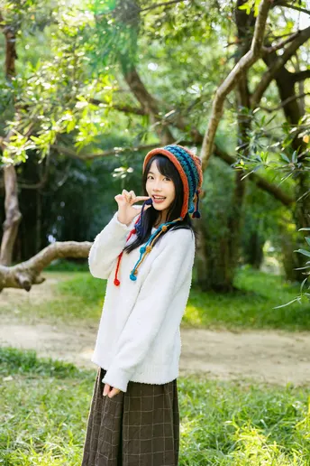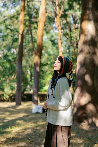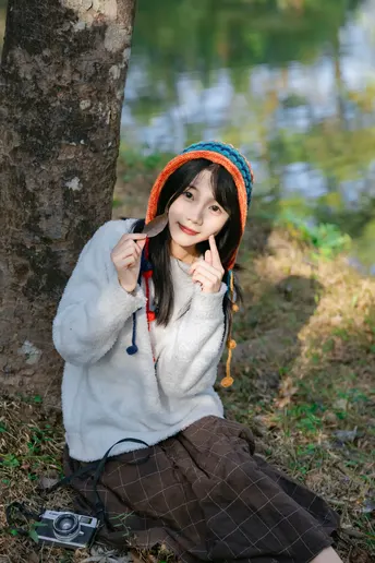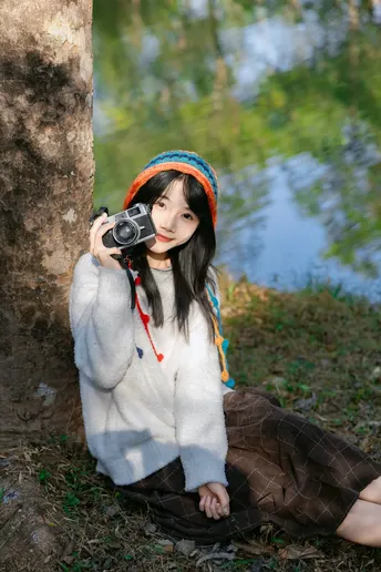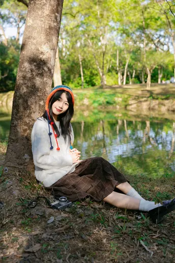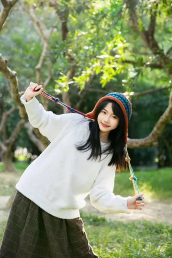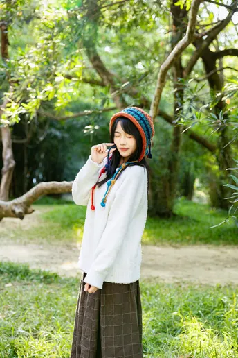 林间信步 出镜:小碎 地点:华南植物园 文案:头戴彩色绒帽的少女,身着白衫棕裙, 在阳光斑驳的林间或倚或坐。 流苏轻扬,笑意浅漾,每一帧都是与秋日草木的温柔邂逅。