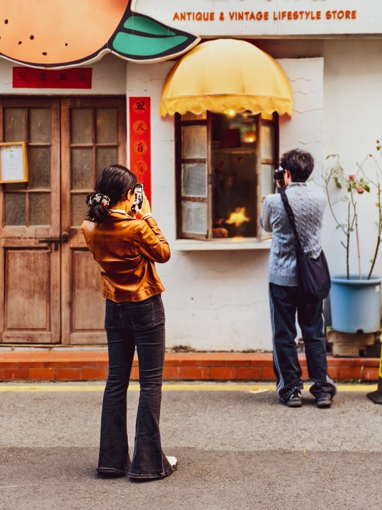 街角这家复古小店,像一块被时光打磨过的蜜糖。暖黄色的雨棚在阳光下泛着绒绒的光,把玻璃窗里的暖光也晕染得格外温柔。 他穿着蓝色的毛衣,举起相机想把这份温暖完整地框住。 她穿着亮面皮衣,扎着俏皮的发夹,举着手机镜头却正对着他。 没人知道,她按下快门的瞬间,是否也发现了自己,正成为我镜头里的风景。 生活就是这样,我们都在各自的取景框里,捕捉着别人,也被别人捕捉着。也许我也正在别人的镜头中。
