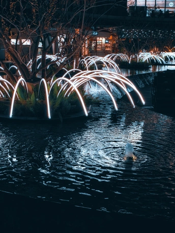 延伸向远处枯树装饰着如枝叶般绽开的灯光,在冷色喷泉的流波中荡漾起闪烁的熠熠光彩。夜色里,这蓝橙碰撞的色调如梦似幻。