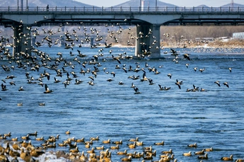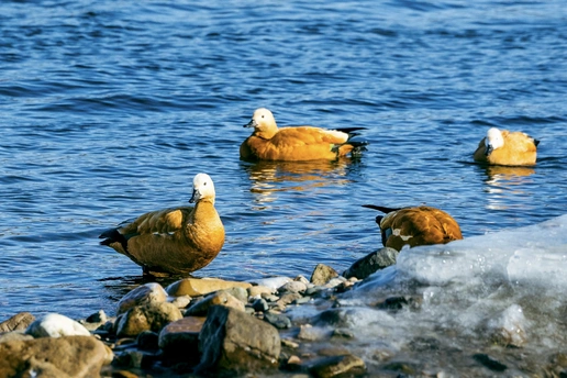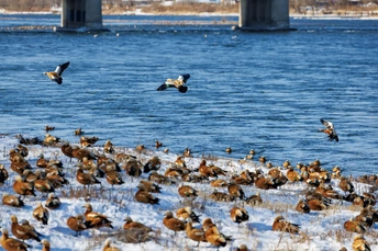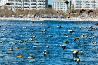 在零下二十度的松花江边,偶遇了一群从远方赴约的赤麻鸭。雪未融,江未冻,它们是冬日里最鲜活的一抹橙。 拍摄于吉林市松花江长白岛湿地公园。因江水不冻、有专人护鸟投食,每年冬季会聚集成千上万只赤麻鸭;10月底—11月初抵达,次年3—4月北迁回蒙古、西伯利亚及我国北方繁殖地。