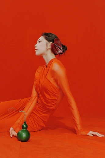 这组作品,将新春的红、新中式的雅与传统吉物织进一帧绛色里: 橘红纱裙裹着舒展的身姿,鬓边那枚红掌,是岭南春日里鲜活的吉庆; 手边垂着藤蔓的葫芦,藏着 “福禄” 的古意祝福。 红底如岁时铺展的新笺,纱裙的褶皱是时光的轻痕,人物的侧影一半浸在传统的温软里,一半透出当代的舒展 —— 这是新春的底色,也是文化的新声: 以红为韵,以物寄情,让福禄随春而至,让传统在新中式的表达里,长出鲜活的诗意。 系列:时尚岭南 策划:Tommy汤面 & 三惑王