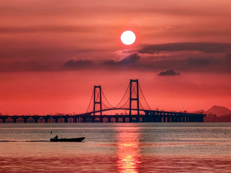 当赤红晨光铺满伶仃洋,深中通道如钢铁巨龙静卧波上。一叶扁舟划破鎏金水面,载着初升的希望缓缓前行。大桥承载湾区速度,小舟载着生活诗意,在同一片霞光里,共赴未来。