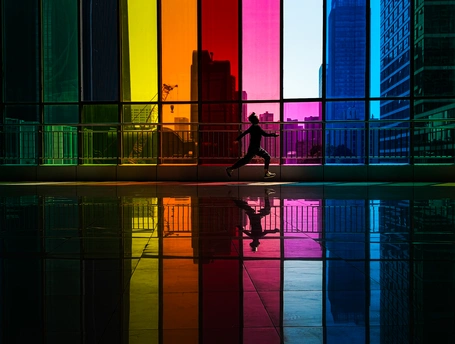 彩色玻璃廊桥下,奔跑者如风掠过。手机定格瞬间,光影在七彩玻璃与地面间流转,动态剪影与静谧廊桥交织,活力与诗意在此刻完美定格。
