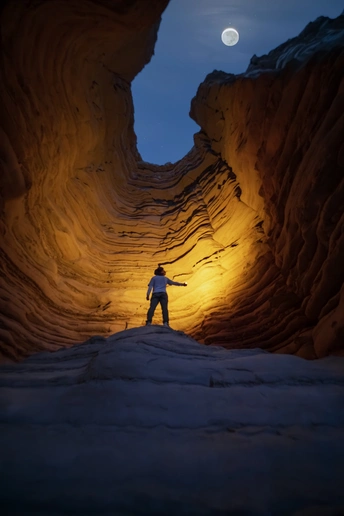 哈密大海道,亿万年风蚀的通天洞,藏着戈壁最温柔的夜。月亮恰好落在洞口,像天开了一扇窗。我提着灯站在黑暗里,抬头望,人间与星河,只隔一轮月光。