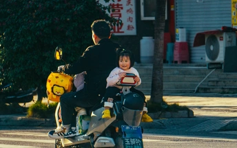 贵州省黔西南布依族苗族自治州望谟县县城,冬日黄昏,小女孩高兴的坐在摩托车上,行驶在回家的路上。