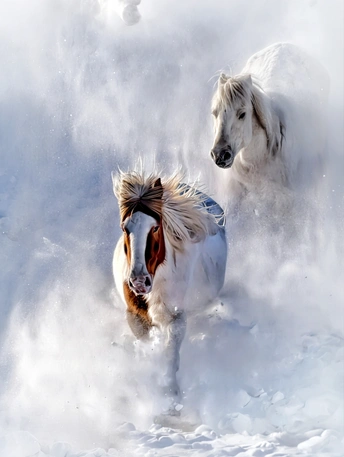 雪野无垠,风卷白浪,两匹骏马踏碎冰封的旷野。鬃毛如火焰般在寒风中翻卷,蹄尖溅起的雪沫,是它们挣脱束缚的宣言。 这不是奔跑,是生命在雪原上的纵情舞蹈。每一次腾跃,都撞碎了冬日的沉寂;每一声嘶鸣,都唤醒了沉睡的旷野。它们向着远方奔去,身后扬起的雪雾,是自由最磅礴的注脚。 镜头定格的瞬间,我们看见的不仅是马的力量,更是一种向着旷野、向着未知,永不停歇的生命渴望。
