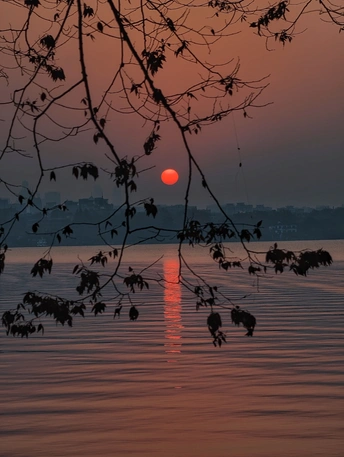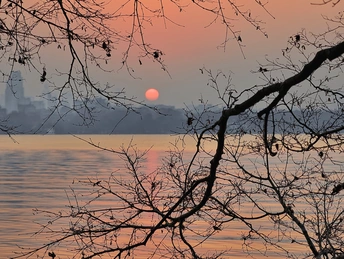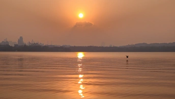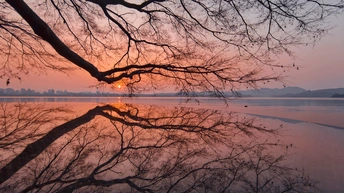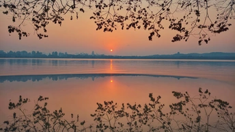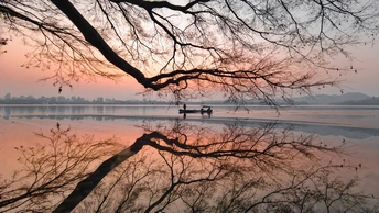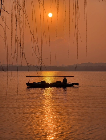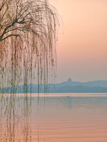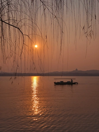 天还未亮透,西湖渐渐苏醒。 晨雾像一层薄纱,漫过湖面,把远山和楼阁都晕成淡墨。第一缕朝阳从保俶塔后探出来,把天空染成温柔的橘粉,又顺着水面铺成一条碎金的路。风很轻,柳丝垂在水面,把自己的影子和天光搅在一起,织成一幅流动的画。 有船摇过,桨声划破寂静,却又很快被湖水吞掉。船影在倒影里轻轻晃,像从旧时光里漂来的梦。岸边的枝桠斜斜探向水面,把朝阳框成一枚暖玉,落在湖心。 这是西湖的清晨,没有游人的喧嚣,只有光与水的私语。每一片倒影都是时光的褶皱,每一缕晨光都是岁月的温柔。我们站在岸边,看日出把世界重新点亮,也看自己的心,在这一片澄澈里,慢慢安静下来。