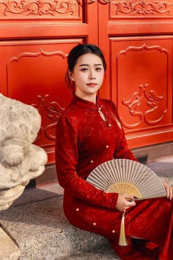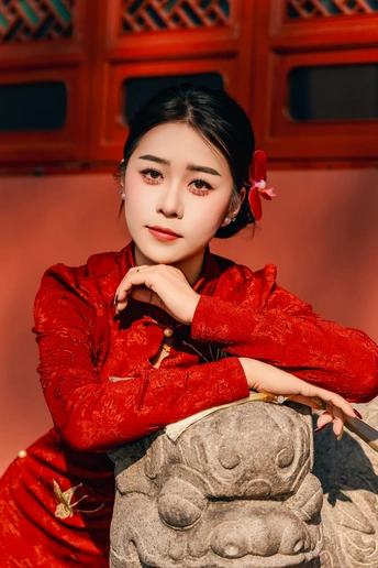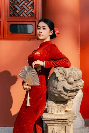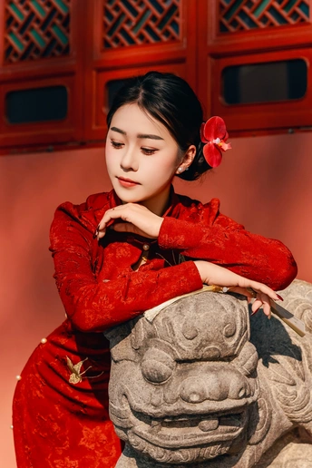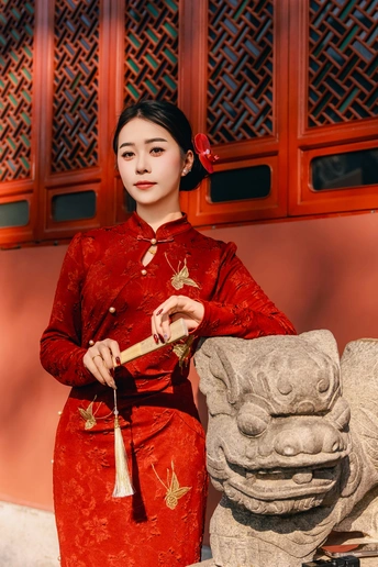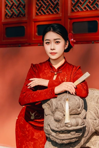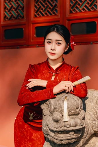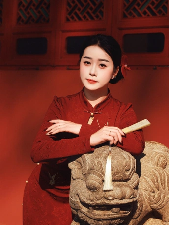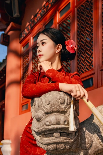 出镜:小甜 地点:广州农讲所 一袭红衣,轻倚石狮,漫步绿意。 在光影交错的红墙与窗棂间, 她手持折扇书卷,眉眼沉静, 将东方古典的温婉与诗意, 凝成时光里一抹永恒的韵。