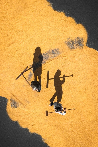 将铺展的稻谷比作金色的波浪,劳作的身影则是在浪尖上的耕耘,充满力量感与画面感。