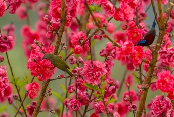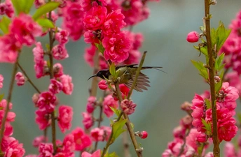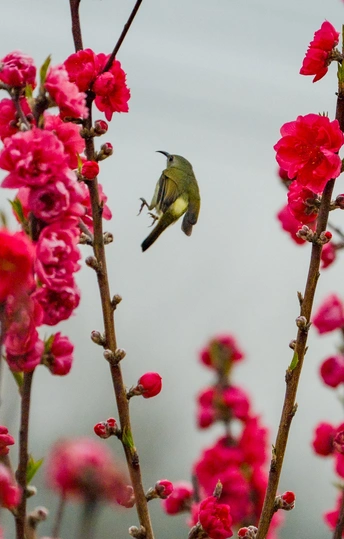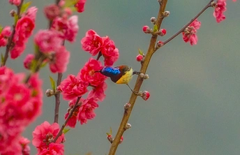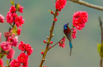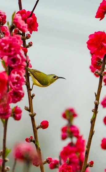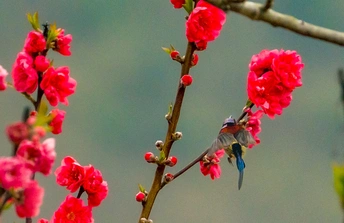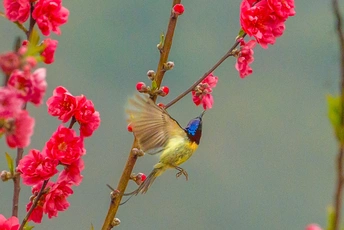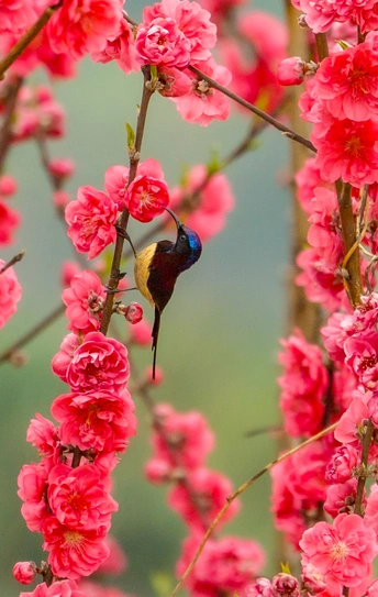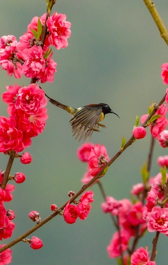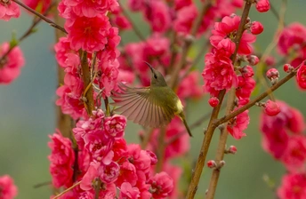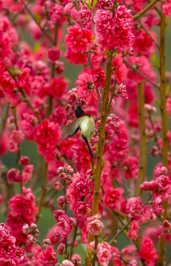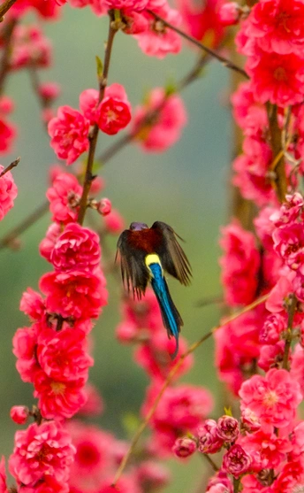 2026年2月22日,贵州省黔西南布依族苗族自治州望谟县天马山,春日融融,繁花盛放,晨光里彩羽翩跹。太阳鸟穿梭花枝间,以细长喙吸食花蜜,灵动身影为春光添韵。 太阳鸟体型小巧、羽色艳丽具金属光泽,被誉为“林间彩宝”,是重要传粉使者。传说凤凰集香木自焚,于烈火中涅槃重生,羽更艳、力更强,象征新生与希望。太阳鸟因羽色如霞光、逐光而栖,被视作凤凰化身,携涅槃祥瑞而来,点亮盎然春意,传递生生不息的美好祝愿。