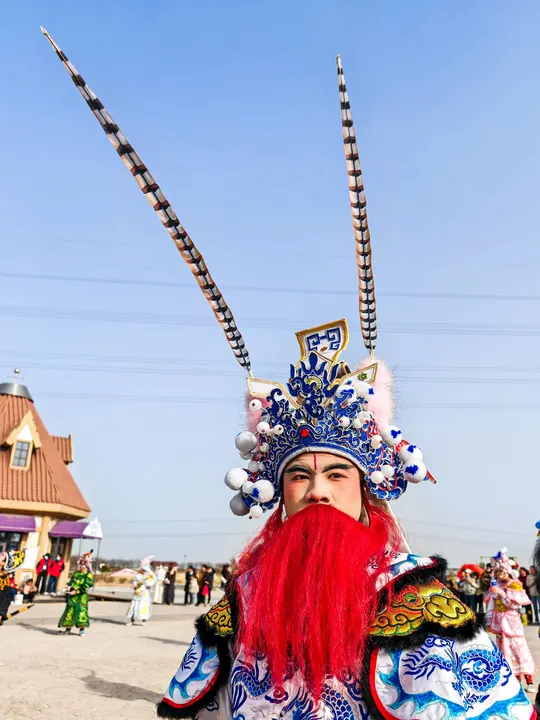 街头巷尾的英歌舞阵中,捕捉到这张极具张力的面孔。赤髯遮面,目光如炬,长翎载着故事,绣纹藏着乾坤,一张脸谱,便是一段人间春秋。