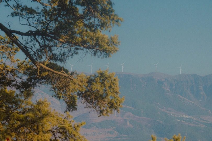 风车像老树的躯干,从树上长了出来。千年的老树与先进的科技同存。七十亿年的地球与年幼的人类也同存着。我们应该善待环境。