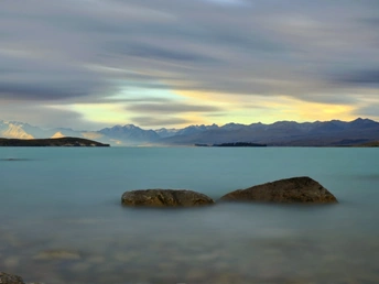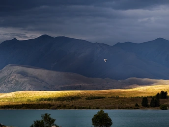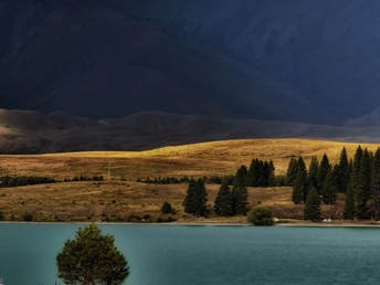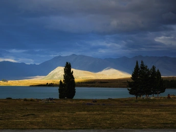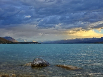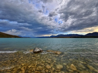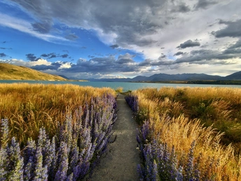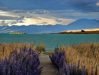 雨歇云开,特卡波湖的空气里还凝着湿润的凉意。夕阳穿透云层,把远山的轮廓镀上一层金红,湖水也从深灰转成通透的蓝绿,像被重新擦亮的宝石。 风里带着草木与泥土的清香,岸边的鲁冰花缀着未干的水珠,在余晖里闪着细碎的光。远处的雪山在暮色中愈发清冽,与湖面的暖光形成温柔的对峙。 这一刻,天地被洗得格外干净,所有浮躁都随雨水流走,只剩一湖澄澈与漫天霞光,把人间的疲惫都轻轻熨帖。