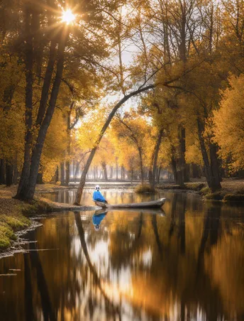 在南疆刀郎部落的胡杨林深处,一汪秋水如镜,将漫天金叶与天光云影悉数收纳。一位身着亮蓝披肩的女子,静坐在古朴的独木舟上,背影融入这片被时光温柔包裹的天地。 阳光穿透层层叠叠的胡杨枝叶,化作千万道金色光束,如丝如缕地倾泻而下,在水面漾开细碎的涟漪。每一片叶子都被镀上暖融融的光晕,仿佛是大地捧出的万千碎金,在秋风中轻轻摇曳,诉说着千年胡杨“生而不死一千年,死而不倒一千年,倒而不朽一千年”的坚韧与浪漫。 独木舟的木纹里,藏着刀郎人世代与水共生的密码。它轻轻系在斜探入水面的胡杨树干上,像一位沉默的老友,见证着这片土地从丝路驼铃到今日炊烟的变迁。女子的蓝披肩在金黄的底色中格外醒目,如同这片苍茫大地上一抹灵动的诗意,将自然的雄浑与人文的细腻完美交融。 这里没有喧嚣,只有风穿过胡杨的低语,水纹漫过舟底的轻响。每一缕光影、每一片落叶、每一道水痕,都在诉说着刀郎部落与胡杨林共生共荣的故事。这不仅是一幅秋日图景,更是一段流淌在南疆大地上的文明记忆,使人心甘情愿地沉醉在这金黄的时光里,让心灵跟着这金色的水波,一起荡漾,去感受刀郎部落那独有的、温暖而厚重的脉搏。