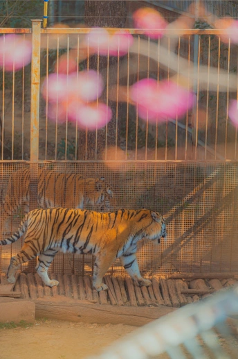 橙黑条纹勾勒出老虎的野性力量,每一步都带着山林王者的沉稳气场。前景虚化的粉色光斑,如温柔花影,在暖调光影里轻轻晕开。虚实构图让虎的威严与花的朦胧共生,暖黄的色调将力量与柔意揉合,刚与柔在画面里悄然相遇,野性与诗意交织成独特的视觉诗行。