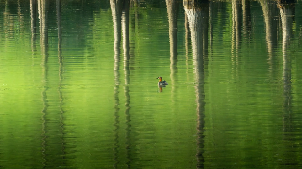 树影沉入水底, 时光在此刻慢下来。 一只小䴙䴘, 正独自丈量着这片绿色的宁静。 万物各得其所,便是最好的春天。