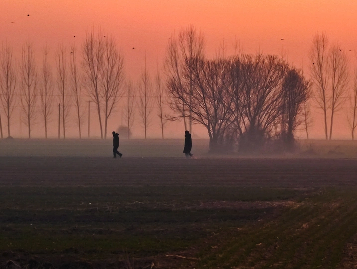 清晨的原野还浸在薄雾里,橘红色的朝阳正缓缓撕开天际,给枯树的枝桠镀上一层温柔的金边。偶然抬眼,见两人步调一致地漫步在田埂,身影被晨雾晕染成朦胧的剪影。头顶有飞鸟振翅掠过,划破这份静谧。这一刻,没有喧嚣,没有纷扰,唯有晨光作伴,脚步同频,才懂世间最珍贵的浪漫,便是这一路并肩,共赴朝暮。